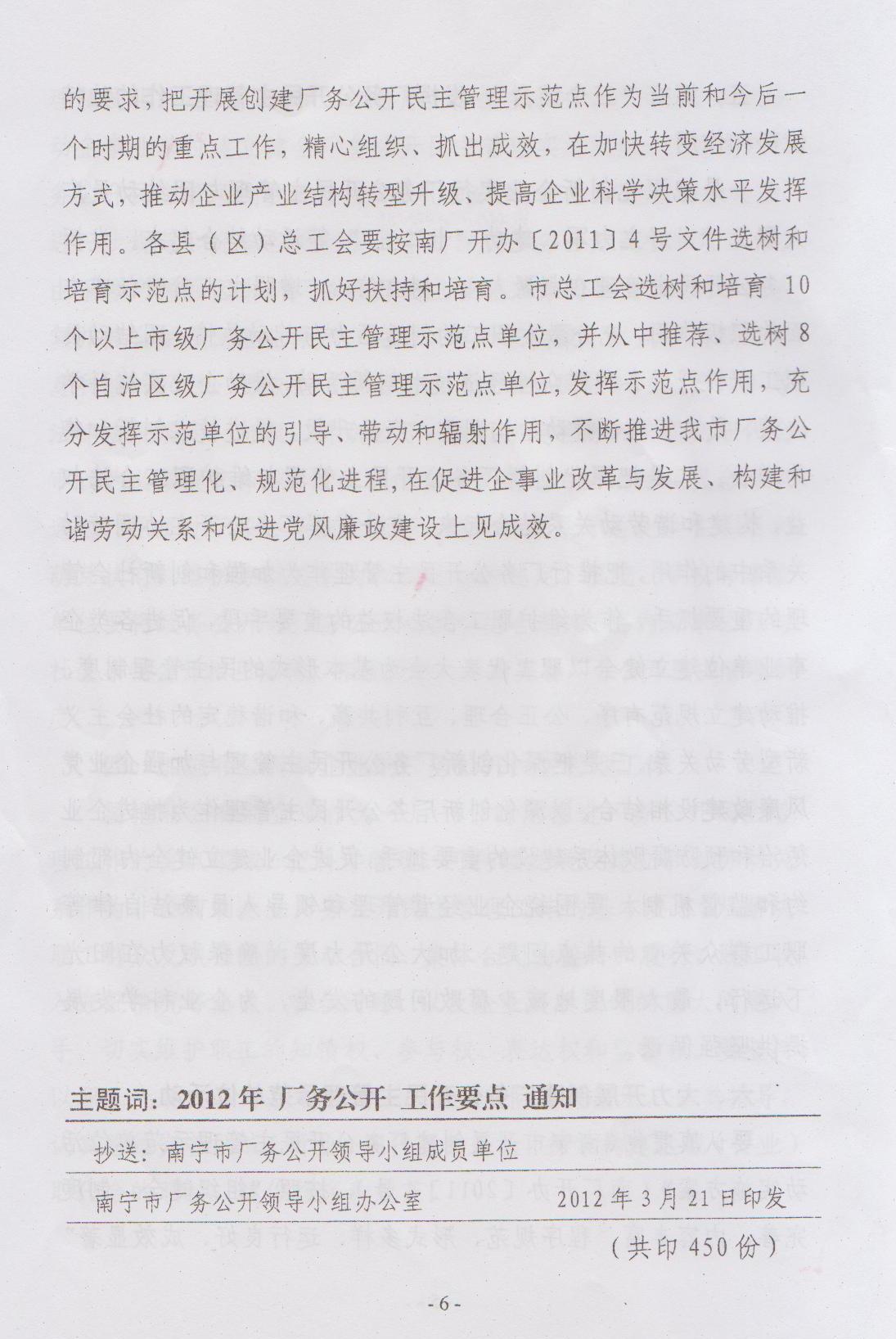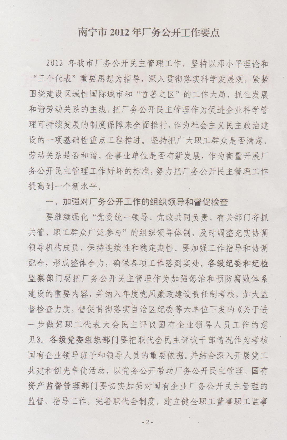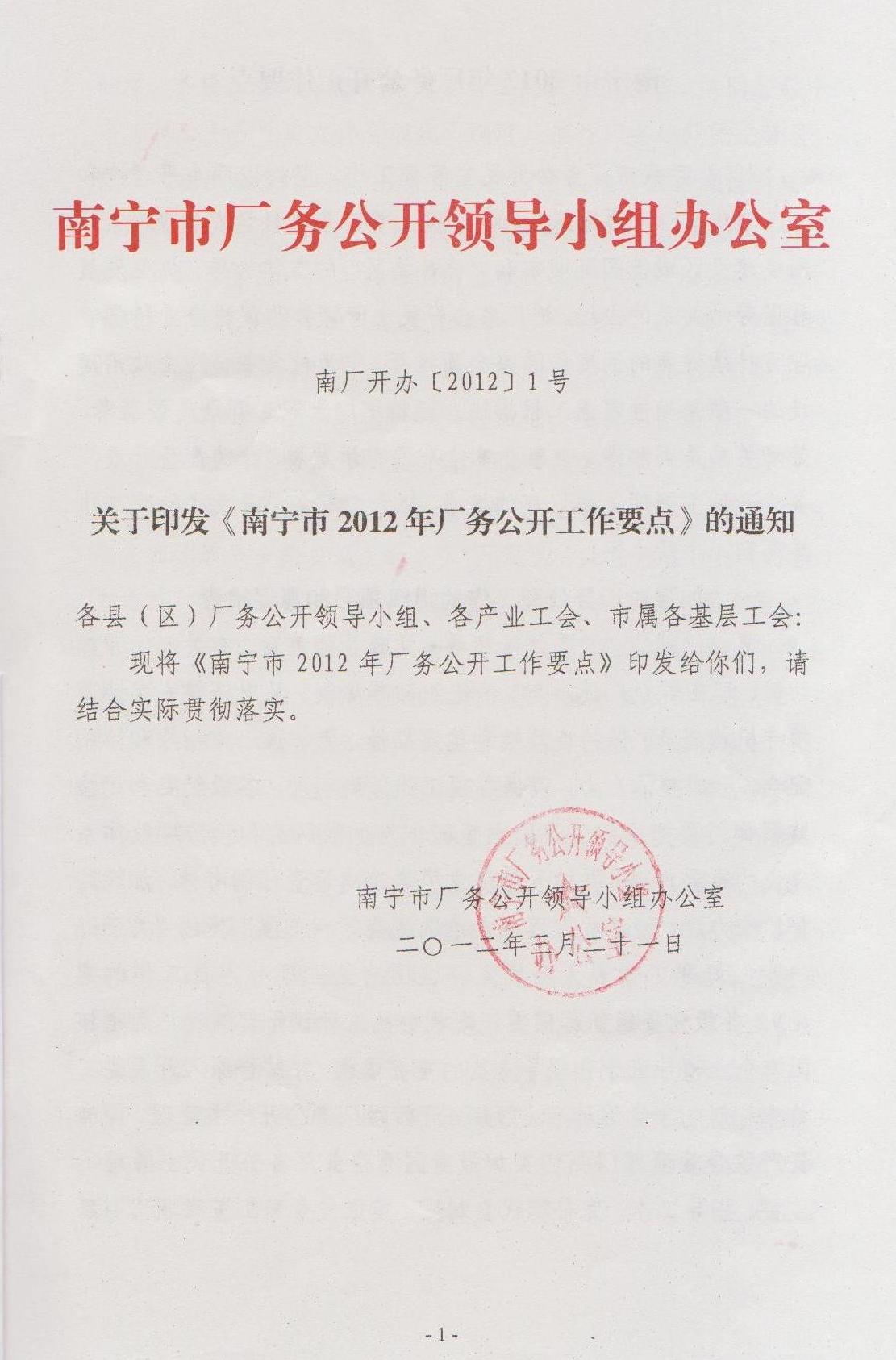 關(guān)于印發(fā)《南寧市2012年廠務(wù)公開工作要點(diǎn)》的通知(南廠開辦[2012]1號(hào))