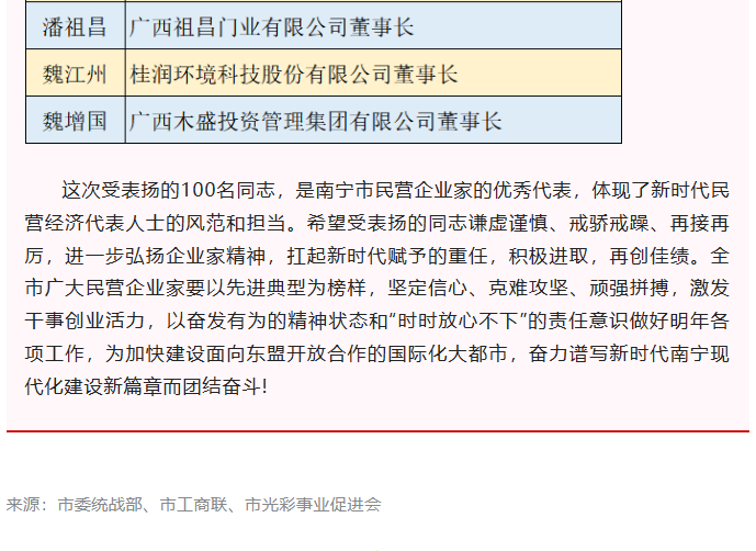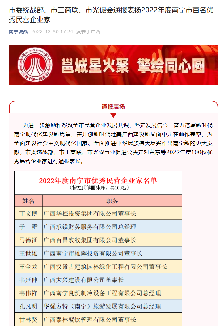 2022年12月30日,南寧市委統(tǒng)戰(zhàn)部、南寧市工商聯(lián)、南寧市光彩事業(yè)促進(jìn)會決定對2022年度100位優(yōu)秀民營企業(yè)家進(jìn)行通報(bào)表揚(yáng),共評出一百名優(yōu)秀民營企業(yè)家。他們是南寧市民營企業(yè)家的優(yōu)秀代表,體現(xiàn)了新時(shí)代民營經(jīng)濟(jì)代表人士的風(fēng)范和擔(dān)當(dāng)。