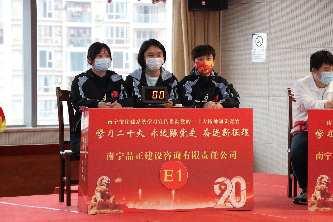 為深入宣傳貫徹黨的二十大精神,全面貫徹落實(shí)習(xí)近平總書記在大會(huì)期間的重要講話,深刻領(lǐng)悟“兩個(gè)確立”的決定性意義,增加“四個(gè)意識(shí)”、堅(jiān)定“四個(gè)自信”、做到“兩個(gè)維護(hù)”,引導(dǎo)廣大干部群眾認(rèn)真學(xué)習(xí)領(lǐng)悟黨的二十大提出的新思想、新部署、新要求,通過以賽促學(xué),以賽促用,營造濃厚學(xué)習(xí)氛圍。2023年1月5日、6日,黨員何卉芷、入黨積極分子張藝梅、青年代表覃夏代表品正黨支部參加了由南寧市住建設(shè)行業(yè)黨委舉辦的“學(xué)習(xí)宣傳貫徹黨的二十大精神”知識(shí)競賽。取得了第三名的好成績。