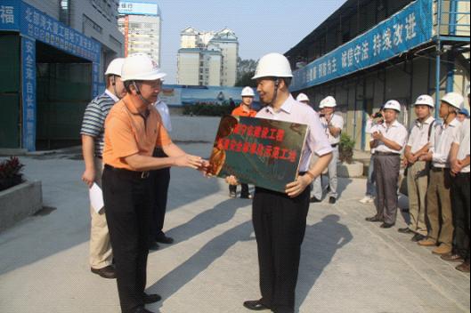 南寧市建筑管理處黨委書記馮仕文(左)授牌,區(qū)五建項目經(jīng)理接牌