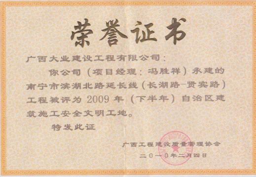 南寧品正負責監(jiān)理的廣西農(nóng)科院職工住宅樓(科苑小區(qū))1、2、4、6、8#樓工程、南寧市濱湖北路延長線(長湖路-賢賓路)工程、半島·旺角1#、2#、3#、5#樓及商業(yè)裙樓工程等多個工程分別榮獲市建設委員會頒發(fā)的“南寧市建設工程施工現(xiàn)場安全文明工地”稱號。同時,南寧品正負責監(jiān)理的南寧-東盟經(jīng)濟開發(fā)區(qū)D標排水主干系統(tǒng)17路段東干渠改造工程也獲得了北海市建設委員會、北海市建筑業(yè)聯(lián)合會共同頒發(fā)的“北海市建設工程安全文明工地”稱號。