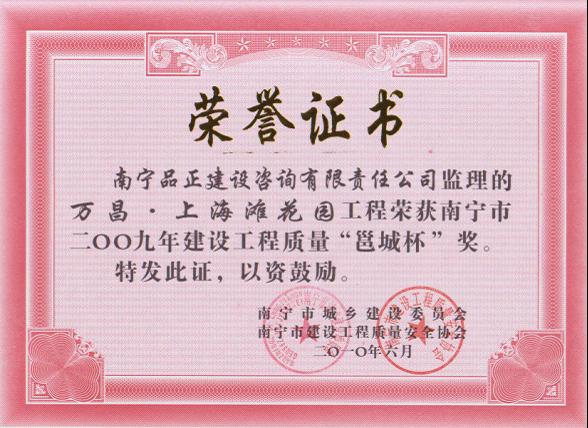 2010年6月,南寧品正負(fù)責(zé)監(jiān)理的南寧市南站南側(cè)路工程C標(biāo)、E標(biāo)、南寧市江南堤路園項(xiàng)目市政工程道路施工1#標(biāo)、南寧市精品線路綜合整治工程(一期)B標(biāo)、南寧市五象廣場周邊區(qū)域市政設(shè)施綜合整治工程I標(biāo)工程、南寧市五象廣場周邊區(qū)域市政設(shè)施綜合整治工程I標(biāo)、南梧大道工程(高速環(huán)二塘收費(fèi)站到三塘下丹橋)NO.7標(biāo)段、萬昌·上海灘花園工程、廣西明陽工業(yè)園啟動區(qū)道路工程III標(biāo)等多個(gè)工程分別榮獲南寧市城鄉(xiāng)建設(shè)委員會、南寧市建設(shè)工程質(zhì)量安全協(xié)會頒發(fā)的南寧市2009年建設(shè)工程質(zhì)量“邕城杯”獎(jiǎng)。
