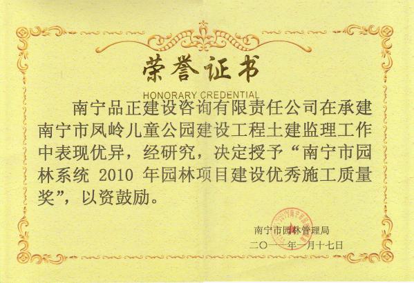 2011年1月17日,南寧品正負(fù)責(zé)監(jiān)理的南寧市鳳嶺兒童公園建設(shè)工程榮獲南寧市園林管理局頒發(fā)的“南寧市園林系統(tǒng)2010年園林項(xiàng)目建設(shè)優(yōu)秀施工質(zhì)量獎(jiǎng)”。