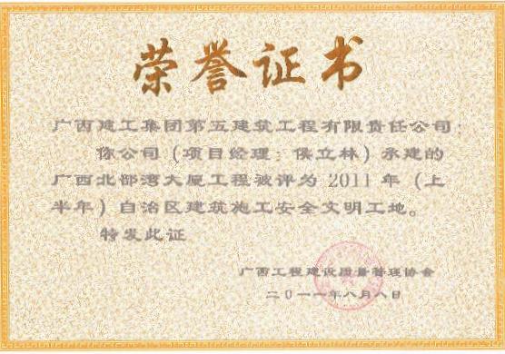 廣西北部灣大廈工程被評為2011年(上半年)自治區(qū)建筑施工安全文明工地榮譽證書