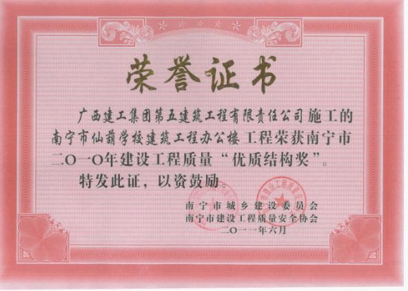 南寧市仙葫學(xué)校建筑工程辦公樓榮獲南寧市二〇一〇年建設(shè)工程質(zhì)量“優(yōu)質(zhì)結(jié)構(gòu)獎(jiǎng)”榮譽(yù)證書